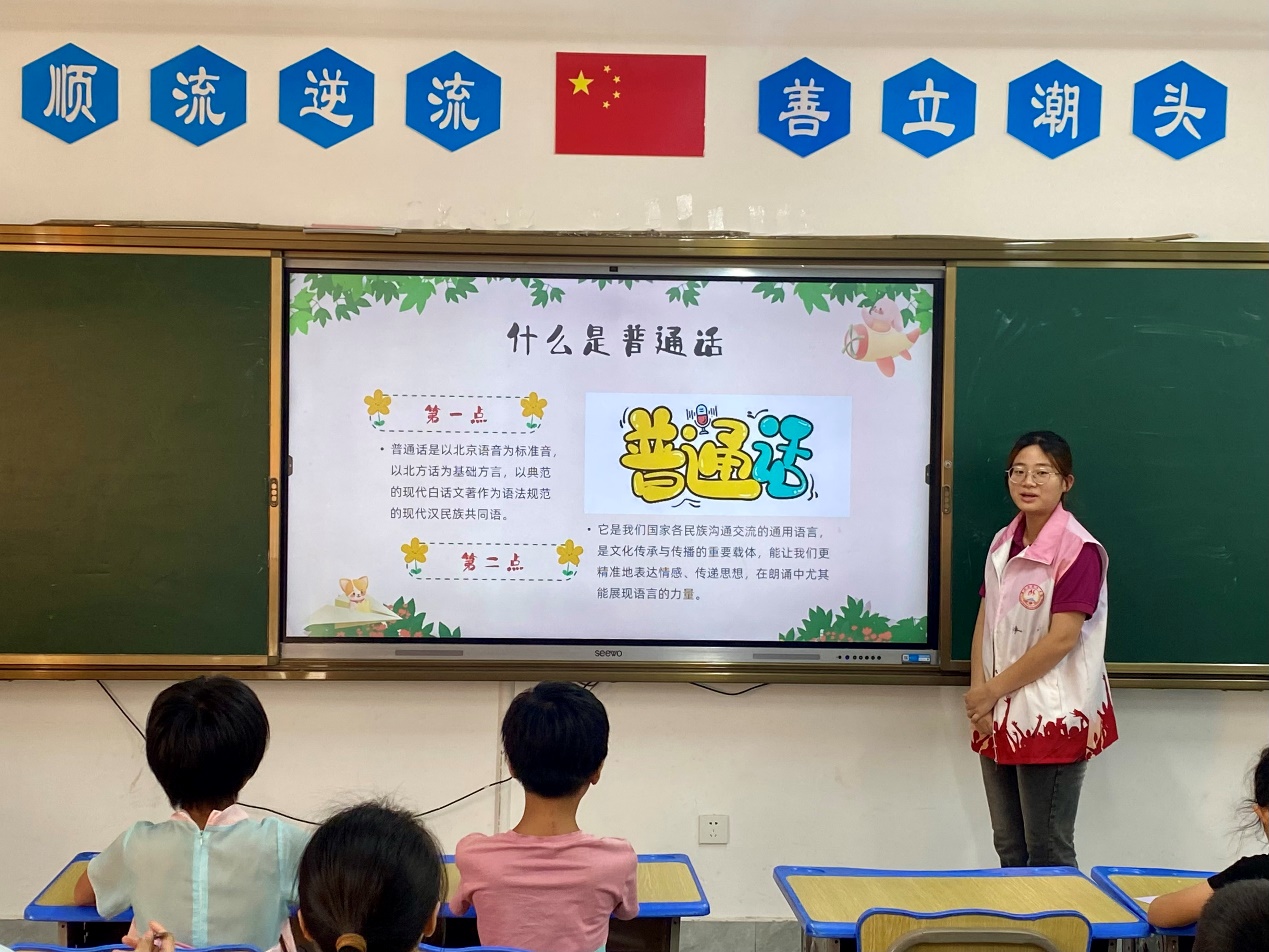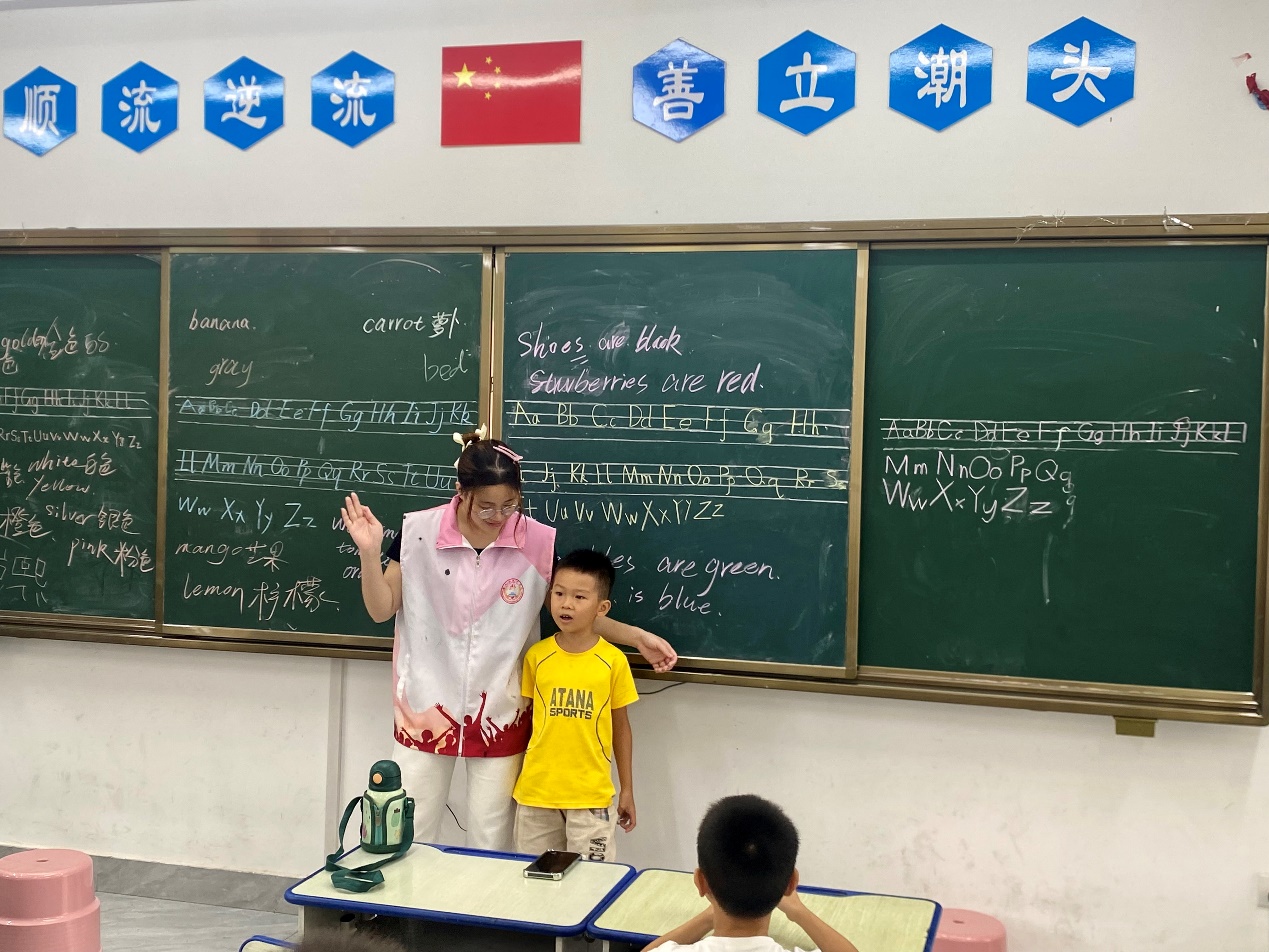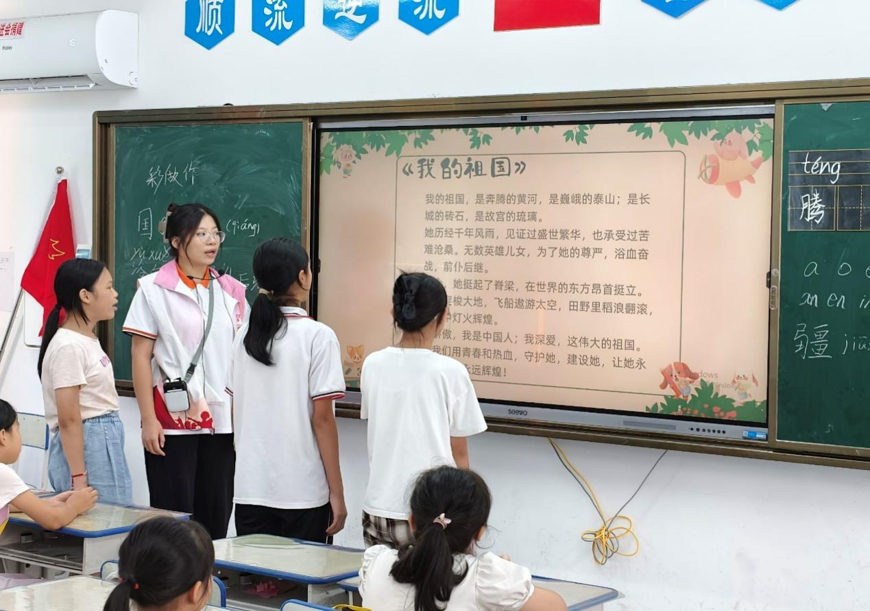 语言教育同样是支教的重点。针对乡村孩子普通话基础薄弱的问题,团队以“推广普通话,点亮乡村梦”为主题,在“普通话与朗诵”课程中志愿者们设计了 “绕口令闯关”、“诗歌小剧场”等趣味环节。孩子们在语言表达的突破中,逐渐打破“语言贫困”的壁垒。而“外语情景秀”课程上,志愿者们则通过 “动物乐园”、“校园超市”等沉浸式场景,让英语从课本走向生活。