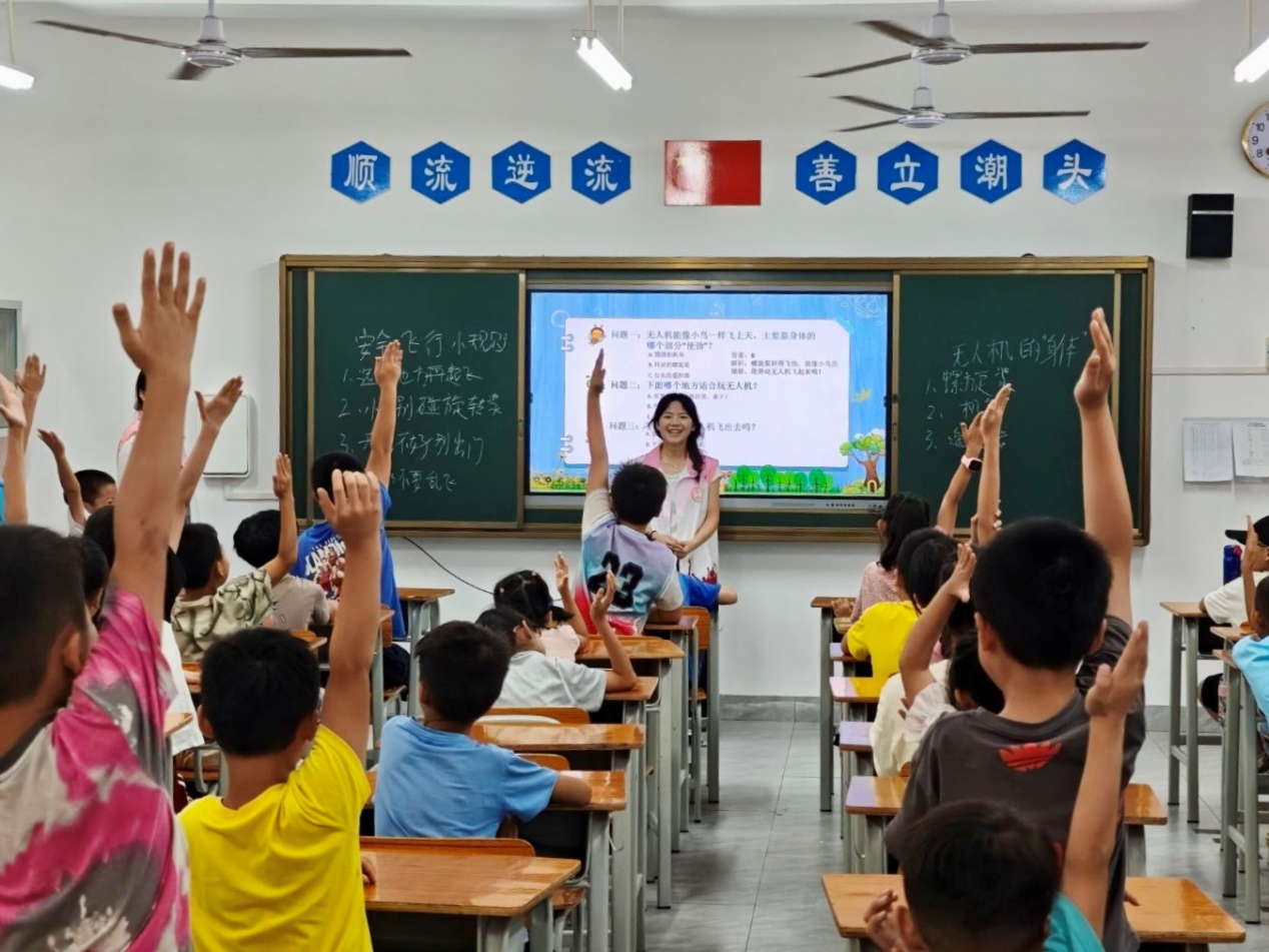 (孩子们在学习“科学实验探索营”课程的无人机试飞部分知识)