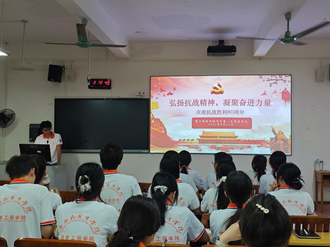 为深入学习贯彻习近平总书记关于铭记历史、缅怀先烈的重要论述,大力弘扬伟大抗战精神,2025年9月15日,数字科技学院学生第二党支部在大成楼C303教室,举办“‘铭记抗战历史,传承红色基因’——庆祝抗战胜利80周年”主题党日活动。