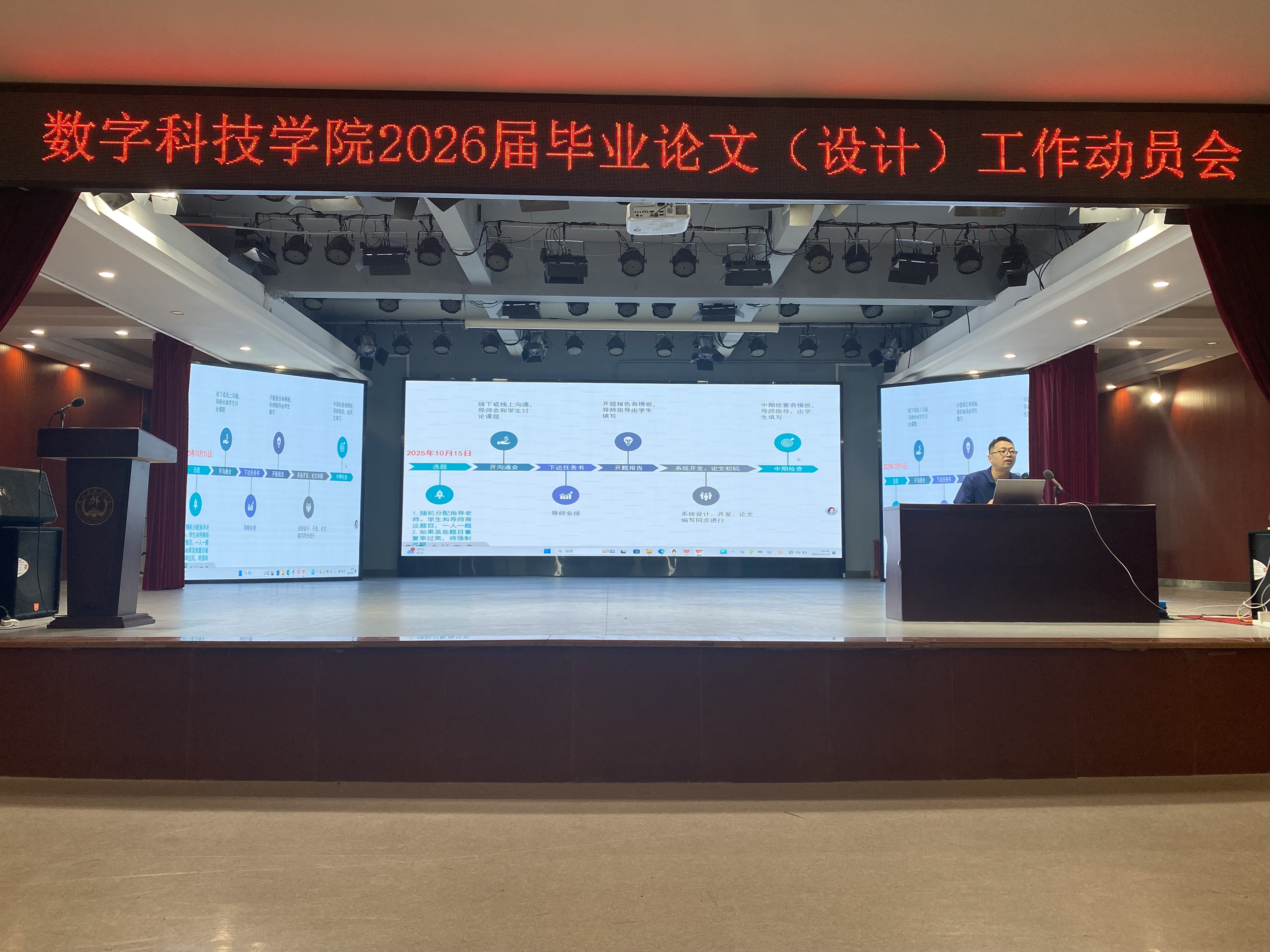 2025年10月14日,数字科技学院在学校大礼堂,召开2026届本科毕业论文动员会。学院分管教学副院长陈忠伟、各系主任、论文指导教师代表及2026届全体本科毕业生参加会议。会议围绕“明确要求、规范流程、严把质量”主题,系统部署毕业论文工作,为即将启动的论文撰写阶段奠定坚实基础。