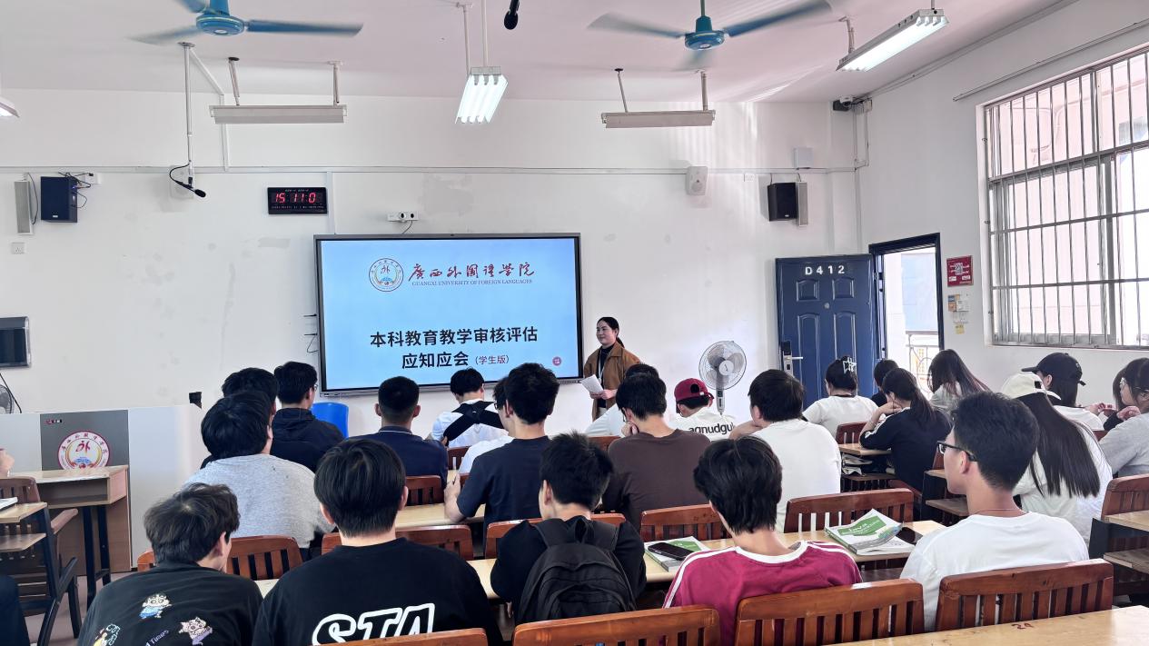班会核心环节围绕《广西外国语学院本科教育教学审核评估应知应会知识手册(学生版)》展开。学习紧扣三项重点:
