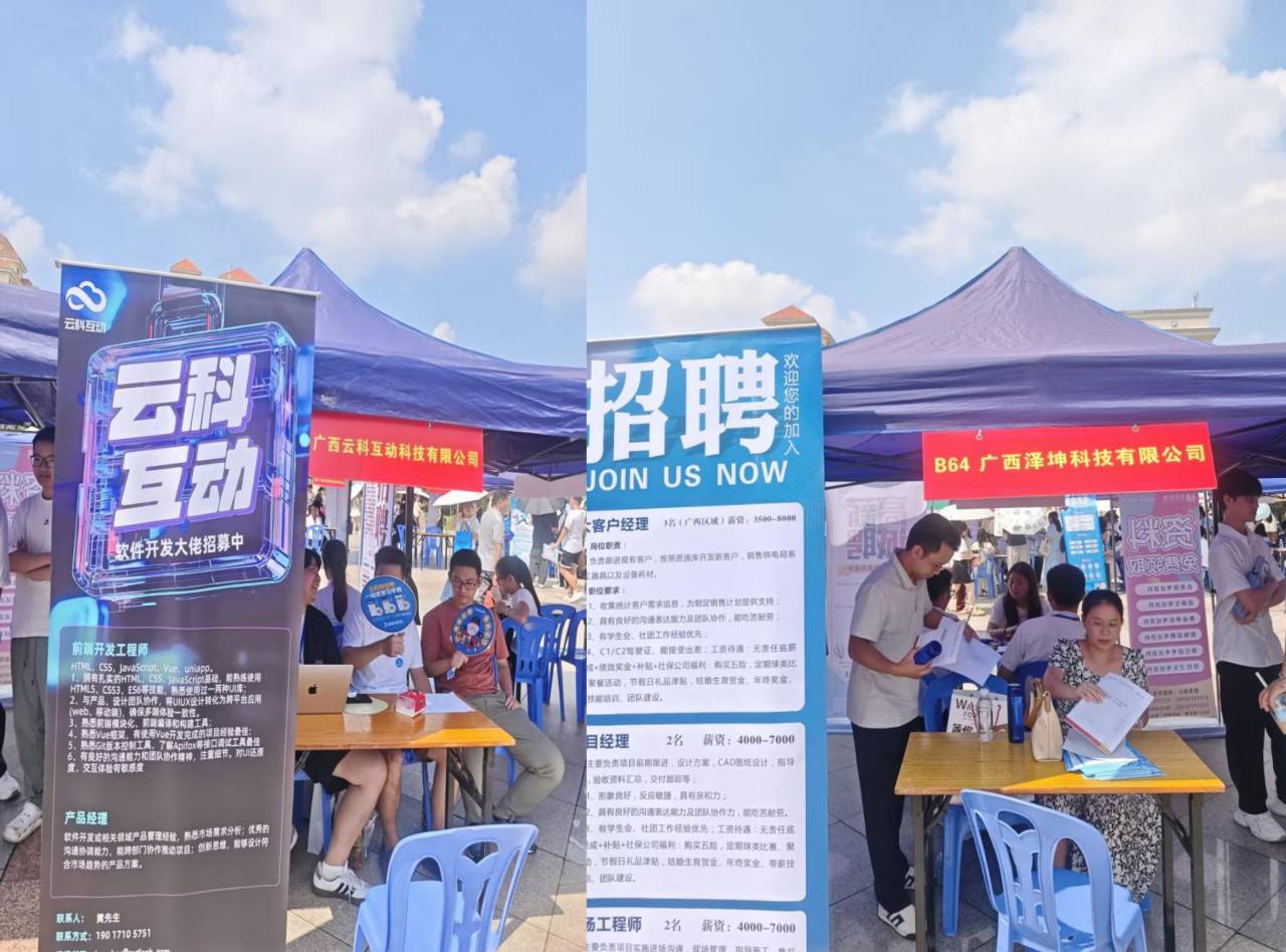 在双选会现场,两家校友企业——广西云科互动科技有限公司和广西泽坤科技有限公司设立了展位,吸引了众多学生前来咨询和投递简历。广西云科互动科技有限公司由2025届软件工程毕业生侯俊宏创办,此次招聘主要面向软件开发领域的优秀人才。广西泽坤科技有限公司则由2018届网络工程毕业生余财东创办,提供了大客户经理、项目经理等多个职位。