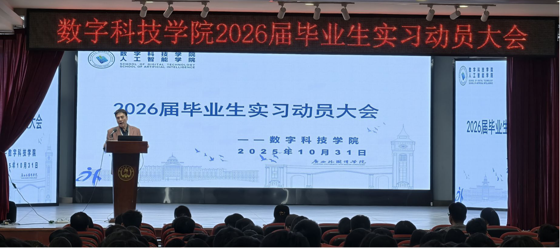 10月31日下午,数字科技学院举行2026届毕业生实习动员大会。学院院长覃海生、党总支书记钟明辉、副院长黎晓凤、辅导员韦云润及毕业班班主任、全体2026届毕业生参会。大会围绕“安全、规范、成长”主题,从实习安全、实习报告撰写、实习就业规划三方面为即将奔赴职场的同学们送上“行前第一课”。