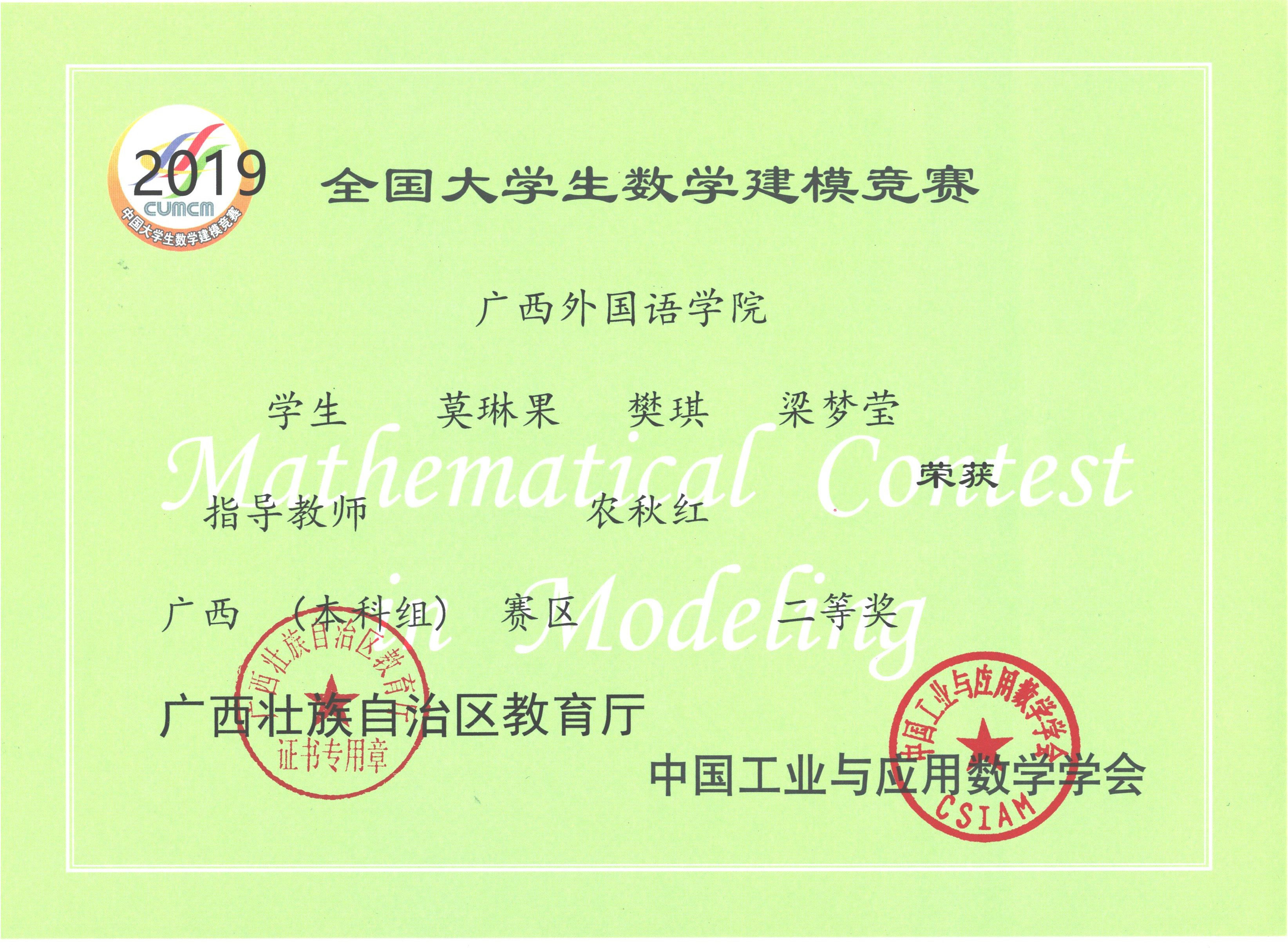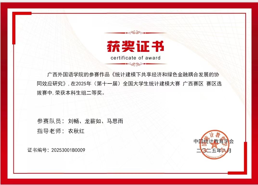 鼓励和指导学生参加各类学科竞赛并屡获佳绩:指导学生获全国大学生数学建模竞赛广西赛区二、三等奖;带领学生拿下全国大学生统计建模大赛广西赛区二等奖;助力学生在全国大学生数学竞赛广西赛区斩获二、三等奖;指导团队在第七届全国高校经济决策虚仿实验大赛总决赛中荣获三等奖。一个个奖项的背后,是她牺牲休息时间的悉心指导,是她对学生潜力的精准挖掘,更是她“让每个学生都发光”的育人信念。