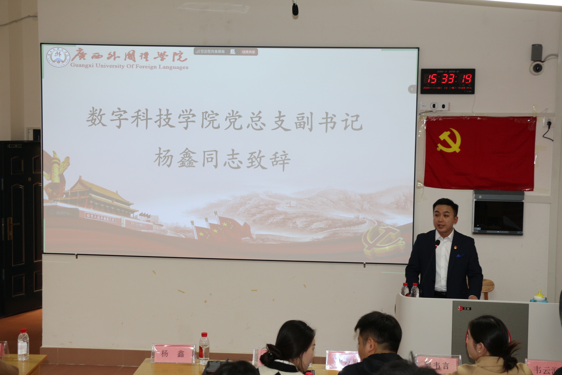 数字科技学院党总支副书记杨鑫同志代表学院党总支向顺利结业的学员表示热烈祝贺,并提出四点殷切期望。希望学员们以此次培训为新起点,持续深化理论武装,筑牢思想根基;自觉加强党性锻炼,提升综合素养;积极投身实践,发挥模范作用;端正入党动机,经受组织考验。杨书记强调,结业不是终点,而是崭新的起点。他勉励学员们要珍惜荣誉,再接再厉,把在培训班养成的优良学风和收获的宝贵财富带回日常学习、工作和生活中,以实际行动向党组织靠拢。