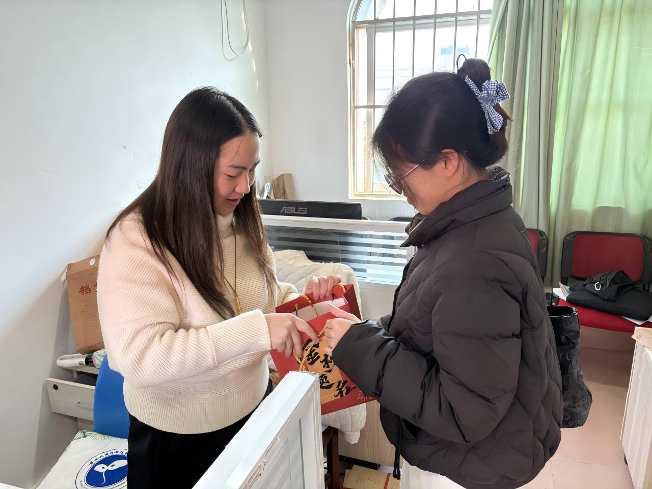 (学院辅导员杨金花给考研学子发放文具大礼包)