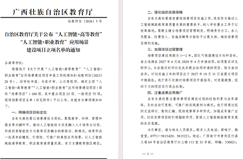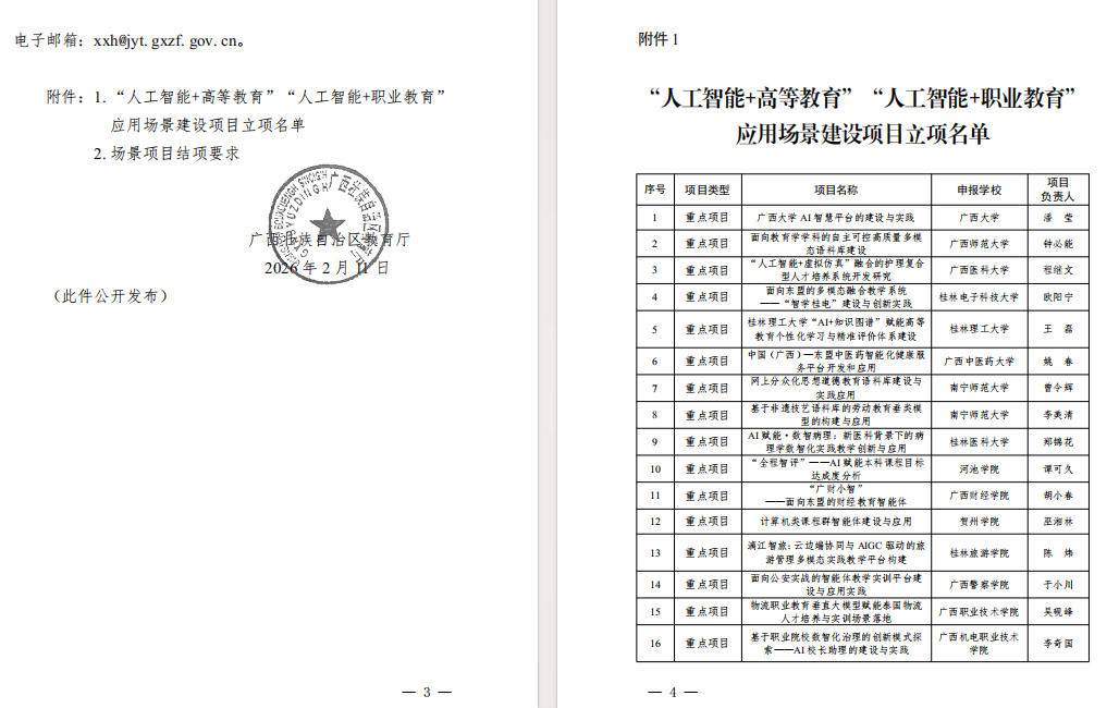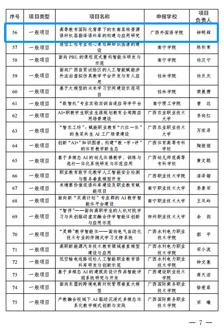 近日,广西壮族自治区教育厅发布桂教网信〔2026〕5号文件,公布全区“人工智能+高等教育”“人工智能+职业教育”应用场景建设项目立项名单。数字科技学院钟明辉教授主持的《高等教育国际化背景下的东南亚稀资源语种机器翻译语料库的构建与应用研究》成功获批一般项目,这是我院在人工智能与东南亚语种教育融合领域的重要突破。