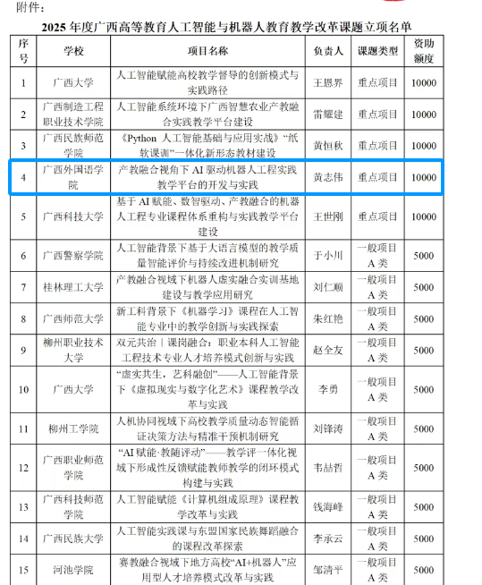 近日,广西高等教育学会发布《关于2025年度广西高等教育人工智能与机器人教育教学改革课题立项的公示》,我院黄志伟老师主持的《产教融合视角下AI驱动机器人工程实践教学平台的开发与实践》项目成功立项,被列为重点项目,获得资助经费10000元。