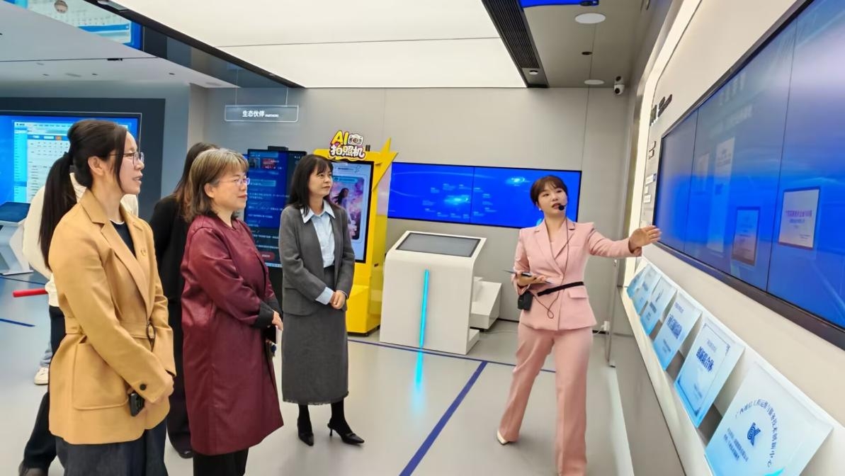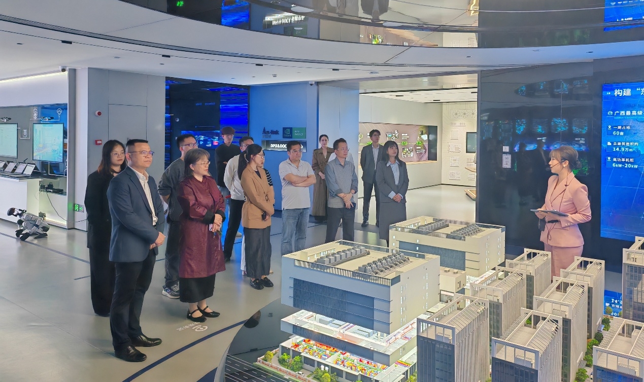 我校代表团首先抵达位于南宁五象新区的润建五象总部,数字科技学院领导班子和人工智能系部分教师一同参与访问。在润建股份相关负责人的陪同下,校方代表参观了人工智能展厅。通过实地观摩与讲解,代表团详细了解了润建股份在算力服务、人工智能大模型及数字化解决方案等领域的最新成果,对企业在“做万物互联的管维者”愿景下所展现出的技术实力给予了高度评价。