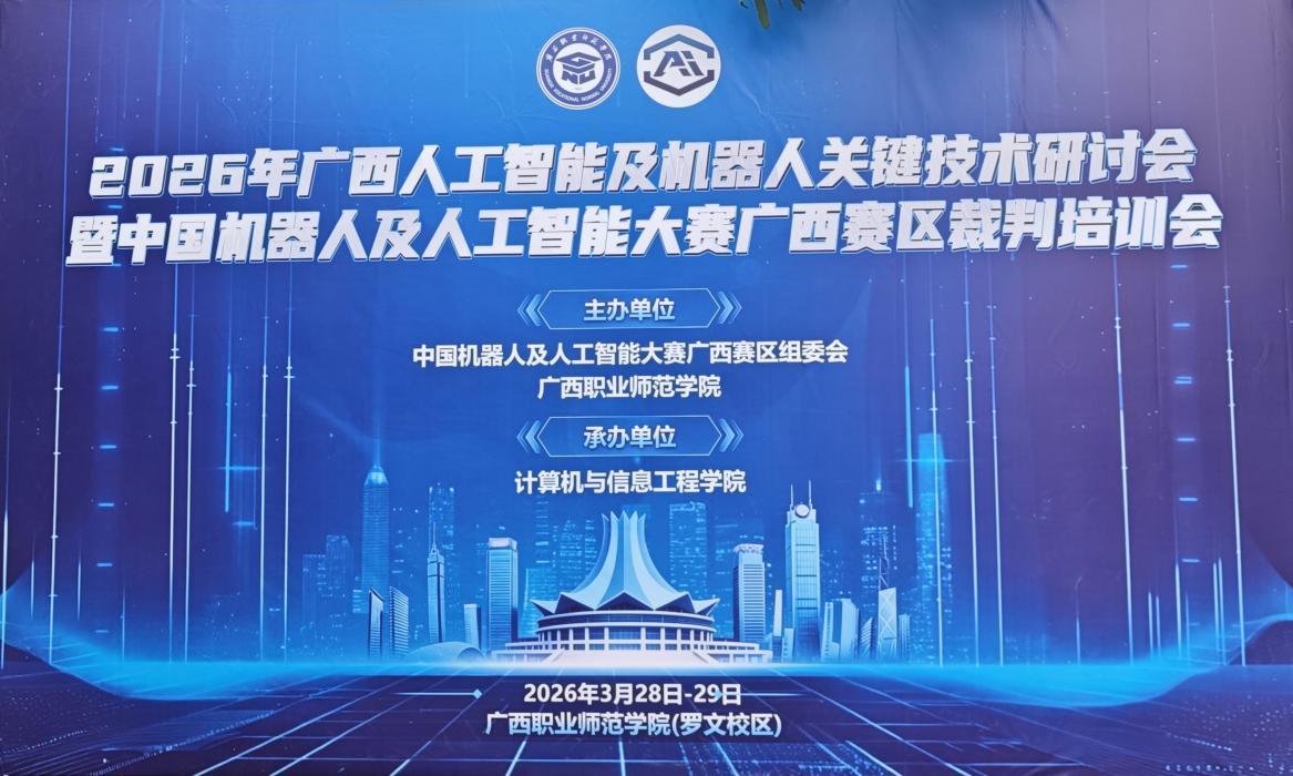 为紧跟人工智能与机器人领域技术前沿,加强与区内高校、行业领域的交流协作,提升学院相关学科教学科研水平及赛事指导能力,3月28日,广西外国语学院院长钟明辉,人工智能系主任黄志伟和计算机科学与技术系教师吕增生受邀参加广西人工智能及机器人关键技术研讨会暨中国机器人及人工智能大赛广西赛区裁判培训会。本次会议汇聚了区内高校相关领域专家学者、行业代表及赛事裁判,为广西人工智能与机器人技术发展、人才培养及赛事规范开展搭建了高效交流平台。